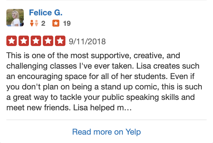 Private comedy coaching is also available! Email Lisa here for pricing and inquires.